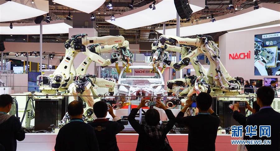 11月5日,日本那智不二越公司展出的點焊密集協(xié)作機器人在進行作業(yè)演示。 新華社記者劉大偉攝