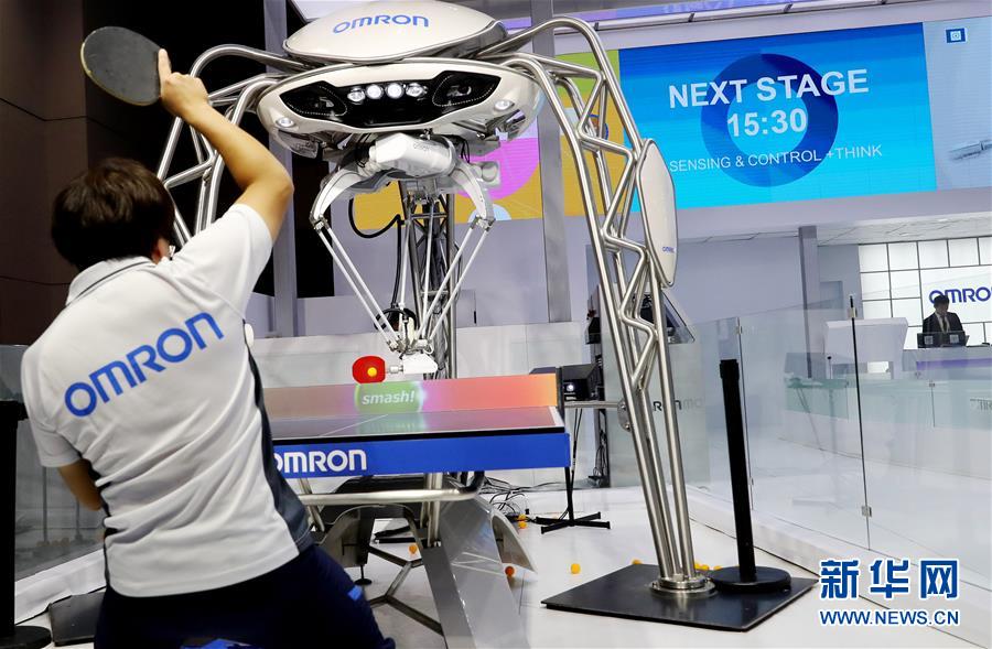 11月5日,一名工作人員在歐姆龍展臺演示與機器人進行乒乓球?qū)?zhàn)。? 新華社記者方喆攝