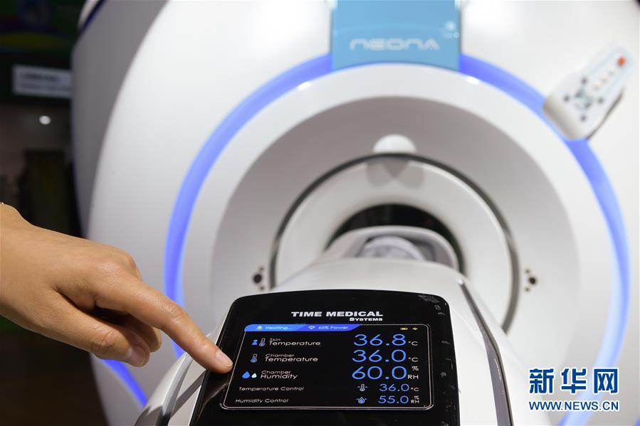 11月8日,美時醫(yī)療(美國)有限公司工作人員為參觀者展示世界首臺嬰幼兒專用核磁共振儀。? 新華社記者李賀攝