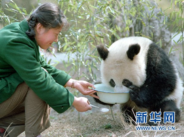 新華社記者金勖琪1980年拍攝的飼養(yǎng)員給即將送往德國的大熊貓“寶寶”喂牛奶。新華社記者 張超群 攝