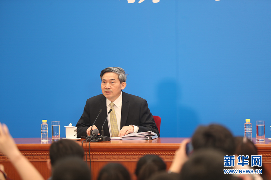3月4日,十三屆全國人大一次會(huì)議在人民大會(huì)堂新聞發(fā)布廳舉行新聞發(fā)布會(huì),由大會(huì)發(fā)言人張業(yè)遂就大會(huì)議程和人大工作相關(guān)的問題回答中外記者的提問。圖為新聞發(fā)布會(huì)主持人何紹仁。新華網(wǎng)/中國政府網(wǎng) 陳杰 攝