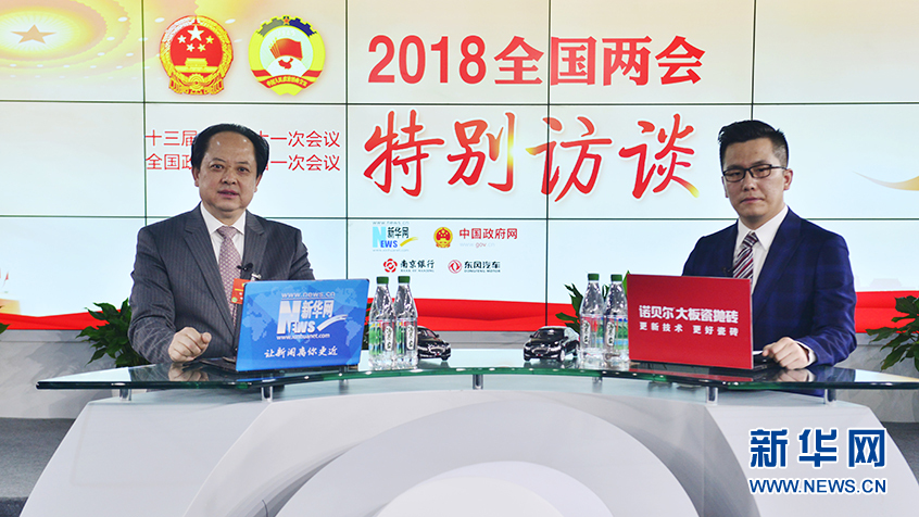 3月5日,全國政協委員、金澳投資集團董事局主席舒心(左)做客新華網2018全國兩會特別訪談。新華網 李相博攝