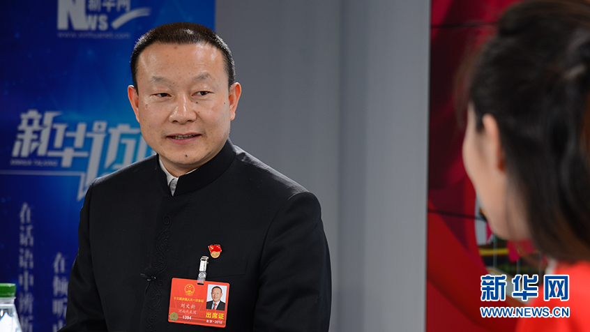 3月7日,全國人大代表、河南省信陽市文新茶葉有限責任公司董事長劉文新(左)做客新華網(wǎng)2018全國兩會特別訪談。新華網(wǎng) 楊濛攝