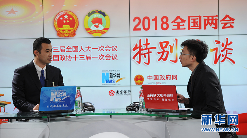 3月9日,全國(guó)人大代表、遼寧三溝酒業(yè)有限責(zé)任公司董事長(zhǎng)吳京耕(左)做客新華網(wǎng)2018全國(guó)兩會(huì)特別訪談。新華網(wǎng)?郭小天攝