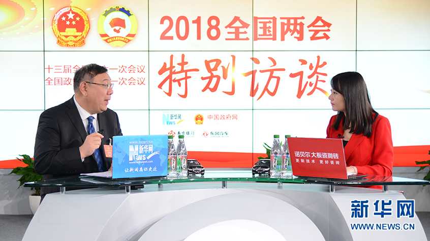 3月12日,全國人大代表、國家電網(wǎng)湖南省電力有限公司董事長孟慶強(左)做客新華網(wǎng)2018全國兩會特別訪談。新華網(wǎng) 楊濛攝