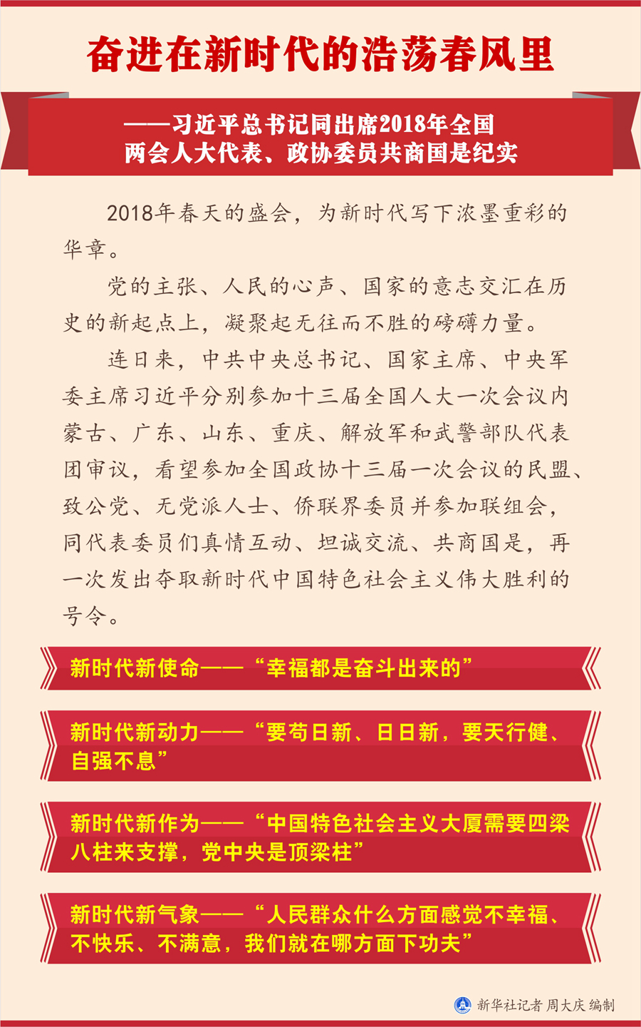 圖表:奮進(jìn)在新時(shí)代的浩蕩春風(fēng)里——習(xí)近平總書記同出席2018年全國兩會(huì)人大代表、政協(xié)委員共商國是紀(jì)實(shí) 新華社記者 周大慶 編制