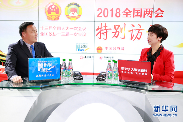 圖為全國(guó)人大代表、河南省平頂山市寶豐縣大黃村黨支部書記馬豹子做客新華網(wǎng)2018全國(guó)兩會(huì)特別訪談 新華網(wǎng) 范作言 攝