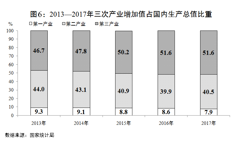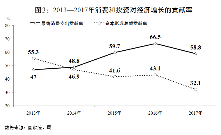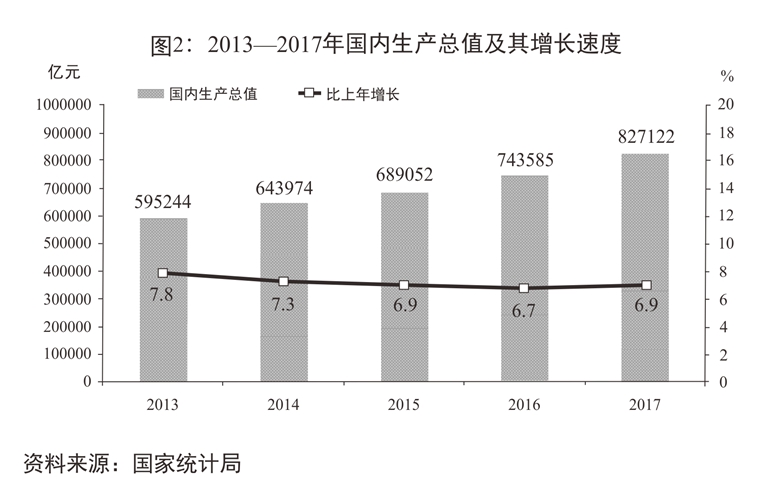 總的來(lái)看,2017年經(jīng)濟(jì)運(yùn)行穩(wěn)中向好態(tài)勢(shì)持續(xù)發(fā)展,決勝全面建成小康社會(huì)又向前邁出堅(jiān)實(shí)一步。在國(guó)內(nèi)外經(jīng)濟(jì)形勢(shì)極其錯(cuò)綜復(fù)雜的情況下,經(jīng)濟(jì)社會(huì)發(fā)展取得這樣的成績(jī)來(lái)之不易,這是以習(xí)近平同志為核心的黨中央堅(jiān)強(qiáng)領(lǐng)導(dǎo)的結(jié)果,是習(xí)近平新時(shí)代中國(guó)特色社會(huì)主義思想科學(xué)指引的結(jié)果,是黨的十八大以來(lái)黨中央、國(guó)務(wù)院一系列重大方針政策和重大舉措累積效應(yīng)的結(jié)果,更是全黨全國(guó)各族人民共同奮斗、各方面工作久久為功的結(jié)果。五年來(lái),各地區(qū)各部門(mén)以習(xí)近平新時(shí)代中國(guó)特色社會(huì)主義思想為指引,堅(jiān)持穩(wěn)中求進(jìn)工作總基調(diào),貫徹新發(fā)展理念,“十二五”規(guī)劃勝利完成,“十三五”規(guī)劃順利實(shí)施。一是經(jīng)濟(jì)實(shí)力顯著增強(qiáng)。國(guó)內(nèi)生產(chǎn)總值從2012年的54萬(wàn)億元增加到82.7萬(wàn)億元,年均增長(zhǎng)7.1%,對(duì)世界經(jīng)濟(jì)增長(zhǎng)的貢獻(xiàn)率超過(guò)30%。二是發(fā)展質(zhì)量和效益明顯提高。全國(guó)一般公共預(yù)算收入從11.7萬(wàn)億元增至17.3萬(wàn)億元。全員勞動(dòng)生產(chǎn)率從人均7.3萬(wàn)元提高到10萬(wàn)元以上。居民人均可支配收入從1.7萬(wàn)元增至2.6萬(wàn)元,增速總體快于經(jīng)濟(jì)增長(zhǎng),城鄉(xiāng)居民收入倍差由2.88∶1下降至2.71∶1。單位國(guó)內(nèi)生產(chǎn)總值能耗降低20.9%。三是經(jīng)濟(jì)結(jié)構(gòu)發(fā)生重大變革。需求結(jié)構(gòu)“消費(fèi)超投資”,最終消費(fèi)對(duì)經(jīng)濟(jì)增長(zhǎng)的貢獻(xiàn)率提高了近4個(gè)百分點(diǎn)。產(chǎn)業(yè)結(jié)構(gòu)“三產(chǎn)超二產(chǎn)”,服務(wù)業(yè)占國(guó)民經(jīng)濟(jì)的比重不斷上升。區(qū)域發(fā)展格局不斷優(yōu)化,新型城鎮(zhèn)化扎實(shí)推進(jìn),8000多萬(wàn)農(nóng)業(yè)轉(zhuǎn)移人口成為城鎮(zhèn)居民。四是新舊動(dòng)能加快接續(xù)轉(zhuǎn)換。供給側(cè)結(jié)構(gòu)性改革扎實(shí)推進(jìn),有效改善了市場(chǎng)供求關(guān)系和企業(yè)盈利狀況。創(chuàng)新驅(qū)動(dòng)發(fā)展戰(zhàn)略深入實(shí)施,天宮、蛟龍、天眼、悟空、墨子、大飛機(jī)等重大科技成果相繼問(wèn)世,新產(chǎn)業(yè)新業(yè)態(tài)新模式層出不窮,傳統(tǒng)產(chǎn)業(yè)通過(guò)改造升級(jí)煥發(fā)生機(jī)。五是市場(chǎng)主體活力持續(xù)釋放。營(yíng)商環(huán)境不斷優(yōu)化,產(chǎn)權(quán)保護(hù)不斷加強(qiáng),公平競(jìng)爭(zhēng)市場(chǎng)環(huán)境進(jìn)一步健全。五年來(lái),國(guó)務(wù)院部門(mén)行政審批事項(xiàng)削減44%,中央層面核準(zhǔn)的企業(yè)投資項(xiàng)目減少90%,中央政府定價(jià)項(xiàng)目縮減80%。大眾創(chuàng)業(yè)萬(wàn)眾創(chuàng)新蓬勃發(fā)展,全國(guó)日均新登記企業(yè)從5400戶上升到1.66萬(wàn)戶,活躍度保持在70%左右,經(jīng)濟(jì)社會(huì)發(fā)展內(nèi)生動(dòng)力不斷增強(qiáng)。六是改革開(kāi)放全面深化。重要領(lǐng)域和關(guān)鍵環(huán)節(jié)改革取得突破性進(jìn)展,主要領(lǐng)域改革主體框架基本確立?!耙粠б宦贰背h由構(gòu)想逐步變?yōu)楝F(xiàn)實(shí),貿(mào)易大國(guó)地位更加鞏固,利用外資保持穩(wěn)定增長(zhǎng),我國(guó)對(duì)世界經(jīng)濟(jì)發(fā)展的影響力大幅提升。七是民生福祉得到有效保障。城鎮(zhèn)新增就業(yè)6600萬(wàn)人以上,脫貧攻堅(jiān)取得決定性進(jìn)展,貧困人口減少6800多萬(wàn)。覆蓋城鄉(xiāng)居民的社會(huì)保障體系基本建立,基本公共服務(wù)均等化程度不斷提高。八是生態(tài)環(huán)境建設(shè)保護(hù)力度持續(xù)加大。大氣、水、土壤污染防治行動(dòng)取得明顯成效,重點(diǎn)區(qū)域PM2.5平均濃度下降30%左右,生態(tài)文明制度體系加快形成,環(huán)境狀況得到改善。