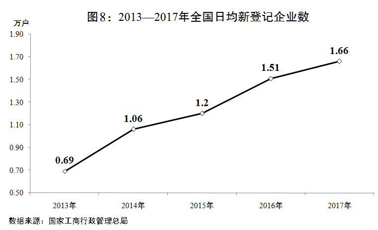 二是大眾創(chuàng)業(yè)萬(wàn)眾創(chuàng)新不斷深化?!秶?guó)務(wù)院關(guān)于強(qiáng)化實(shí)施創(chuàng)新驅(qū)動(dòng)發(fā)展戰(zhàn)略進(jìn)一步推進(jìn)大眾創(chuàng)業(yè)萬(wàn)眾創(chuàng)新深入發(fā)展的意見(jiàn)》(國(guó)發(fā)〔2017〕37號(hào))印發(fā)實(shí)施。新支持92個(gè)國(guó)家雙創(chuàng)示范基地建設(shè),建成4298家眾創(chuàng)空間、3255家科技企業(yè)孵化器和400余家企業(yè)加速器,第三屆全國(guó)雙創(chuàng)活動(dòng)周及“創(chuàng)響中國(guó)”巡回接力活動(dòng)成功舉辦。全年新登記企業(yè)達(dá)到607.4萬(wàn)戶,增長(zhǎng)9.9%,日均新登記企業(yè)達(dá)到1.66萬(wàn)戶。