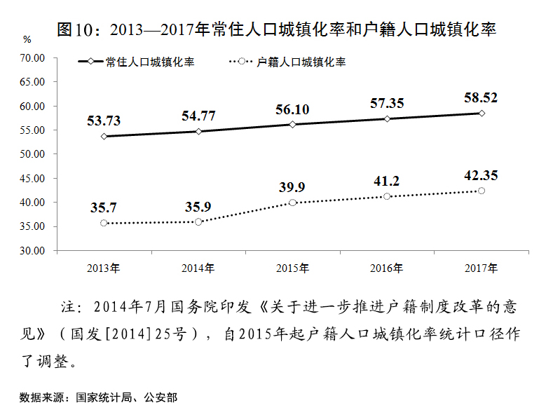 五是以人為核心的新型城鎮(zhèn)化建設(shè)扎實(shí)推進(jìn)。農(nóng)業(yè)轉(zhuǎn)移人口市民化有序推進(jìn),戶籍制度改革和居住證制度落地實(shí)施。全國(guó)常住人口城鎮(zhèn)化率達(dá)到58.52%,戶籍人口城鎮(zhèn)化率達(dá)到42.35%,均比上年增加1個(gè)百分點(diǎn)左右。城鎮(zhèn)化空間格局持續(xù)優(yōu)化,長(zhǎng)三角、長(zhǎng)江中游、成渝、哈長(zhǎng)、中原、北部灣等城市群規(guī)劃加快實(shí)施,關(guān)中平原、呼包鄂榆等跨省區(qū)城市群規(guī)劃編制完成。以市場(chǎng)化方式規(guī)范推進(jìn)特色小鎮(zhèn)和小城鎮(zhèn)建設(shè)。新型城鎮(zhèn)化綜合試點(diǎn)取得積極進(jìn)展。