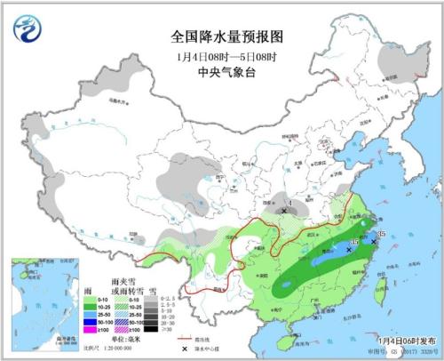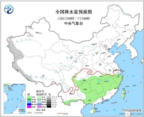 1月4日08時至5日08時,黑龍江中東部、北疆北部和南疆西部山區(qū)、青海中東部、西藏東部和西部、川西高原、陜西中南部、湖北西部、黃淮西部和東南部等地的部分地區(qū)有小雪或雨夾雪;江漢、江淮及其以南大部地區(qū)、西南地區(qū)東部和南部等地的部分地區(qū)有小到中雨,江西中北部、浙江中部和廣西東北部等地的部分地區(qū)有大雨(25~35毫米)。內(nèi)蒙古中北部、黑龍江東北部、遼東半島和山東半島等地的部分地區(qū)有4~6級及以上風(fēng)(見圖1)。北部灣、瓊州海峽、廣東西部沿岸部分海域?qū)⒂写箪F天氣。