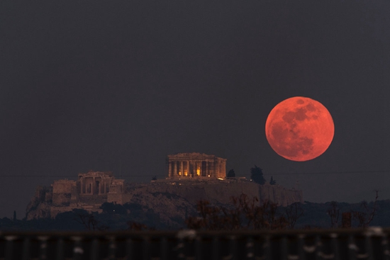 2018年1月31日,超級藍血月亮照耀在雅典神廟上