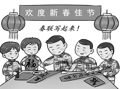 無論鄉(xiāng)村還是城市,春節(jié)家家戶戶都要張燈結(jié)彩。放鞭炮、貼春聯(lián)、逛廟會(huì),其樂融融。能文能武的戰(zhàn)士們,此時(shí)也會(huì)提筆蘸墨,書寫、張貼春聯(lián)和“?!弊郑烟炷虾1钡淖姞I裝點(diǎn)出濃濃年味。