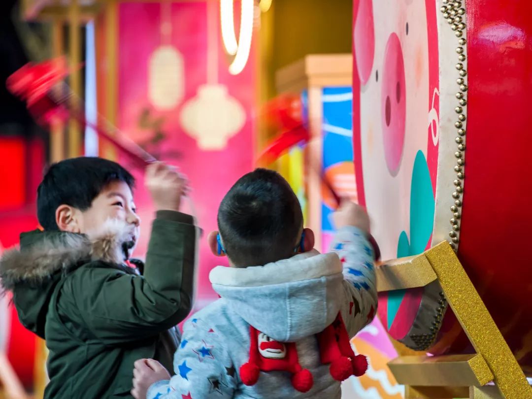 2019-02-01,上海市豫園商城。上海市豫園主題燈展的吉祥大鼓吸引了眾多游客,孩子們在家長的帶領(lǐng)下紛紛排隊上前擂鼓。作者:阿湯哥