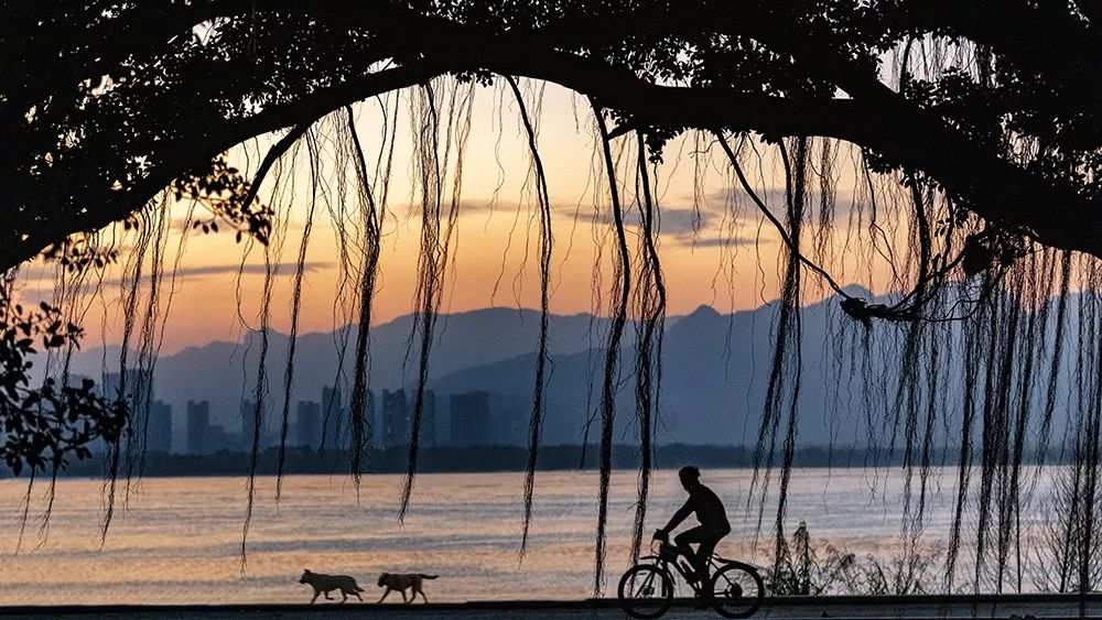2019-01-19,福建省福州市。日落時(shí)分,休閑運(yùn)動(dòng)的騎車(chē)健身者帶著小狗一起享受溫暖的陽(yáng)光。作者:周志強(qiáng)