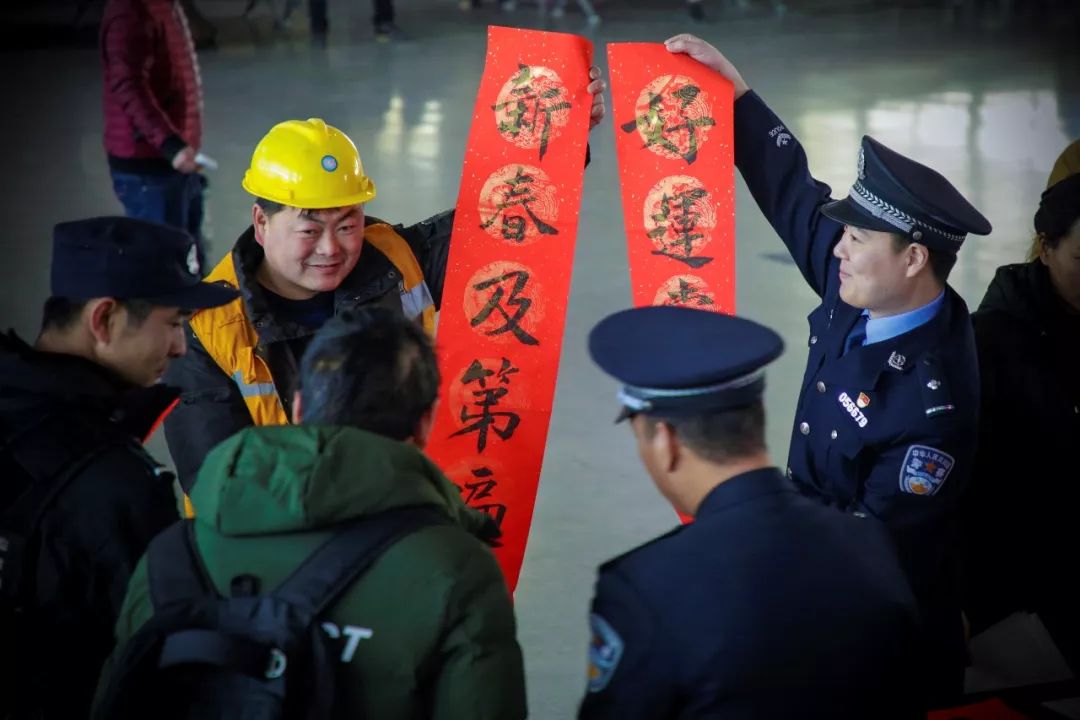 2019-01-21,河南省洛陽市。為城市地鐵建設(shè)忙活一年的工人師傅也乘車回家過年,鐵路民警為其送上春聯(lián),希望他們新年越來越好。作者:陳國(guó)軍