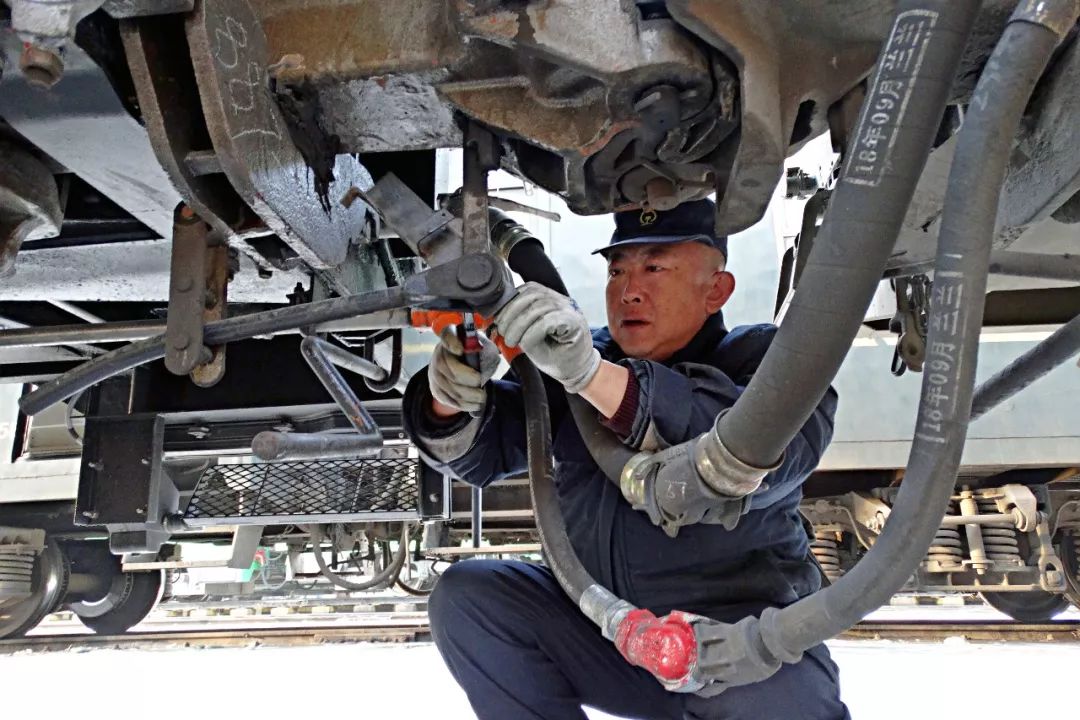 2019-02-08,唐山機(jī)務(wù)段。大年初四,唐山機(jī)務(wù)段的整備人員正在檢修機(jī)車走行部,確保出庫機(jī)車質(zhì)量良好。作者:樂亭閑人