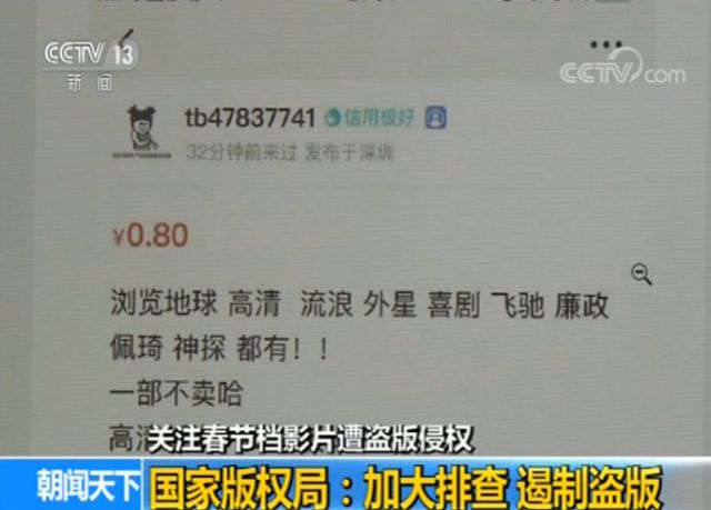 大年初一,多部不同類型和題材的國產(chǎn)影片集中上映,吸引了不少觀眾走進影院。以電影《流浪地球》為例,憑借觀眾口碑,截至15日下午,該片票房已突破32億元,刷新了國產(chǎn)電影的多項票房紀錄。不過《流浪地球》上映沒幾天,該片的盜版資源就開始通過微信朋友圈和微博等渠道在互聯(lián)網(wǎng)上傳播。甚至有人通過微商公然叫賣包含《流浪地球》在內的多部院線影片的盜版資源,不僅聲稱畫質“高清完整”,單部影片售價低至1元不到,打包購買還能享受優(yōu)惠。