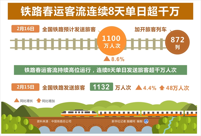 新華社北京2月16日電(記者樊曦、葉昊鳴)記者從中國鐵路總公司獲悉,16日,全國鐵路預(yù)計發(fā)送旅客1100萬人次,同比增長8.6%,加開旅客列車872列。鐵路春運客流持續(xù)高位運行,連續(xù)8天單日發(fā)送旅客超千萬人次。