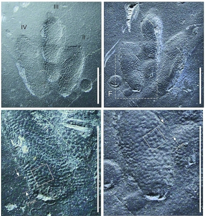 這些精致的小龍足跡一共有4個,組成了一道行跡,仿佛跨越了1億年的時空遇到人類。“小龍足跡僅在韓國和中國發(fā)現(xiàn),是東亞白堊紀的特有足跡。這是世界上第10處發(fā)現(xiàn)有小龍足跡的化石點,也是首次發(fā)現(xiàn)這種足跡的皮膚印痕?!绷昼姁湼嬖V記者。此前,古生物學家從未發(fā)現(xiàn)過有如此完美的皮膚印痕,足跡上的鱗片痕跡平均直徑還不到0.4毫米,而且不同于此前的鱗片印痕僅出現(xiàn)在足跡的部分區(qū)域,小龍足跡保存了整個腳底的皮膚。