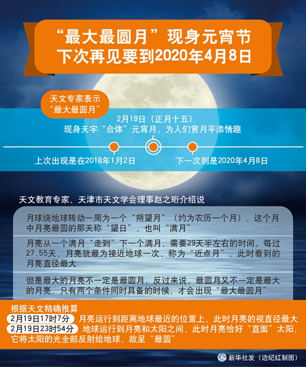 新華社天津2月19日電(記者周潤(rùn)?。┠甓取白畲笞顖A月”19日(正月十五)現(xiàn)身天宇“合體”元宵月,為人們賞月平添情趣。天文專家表示,“最大最圓月”上次出現(xiàn)是在2018年1月2日,下一次則是2020年4月8日。