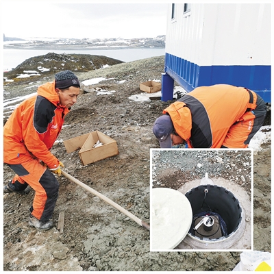 科考隊員挖掘觀測儀器安放坑。小圖為南極地震臺站觀測儀器安放坑。