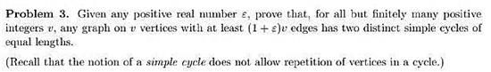 讓中國隊(duì)全軍覆沒的第3題,翻譯過來的大致意思是:給定任何一個正實(shí)數(shù)e,證明除了有限個正整數(shù)以外的所有正整數(shù)v,任何有v個頂點(diǎn)并且有大于等于 (1+e)v條邊的圖至少包含兩個不同的等長簡單回路。