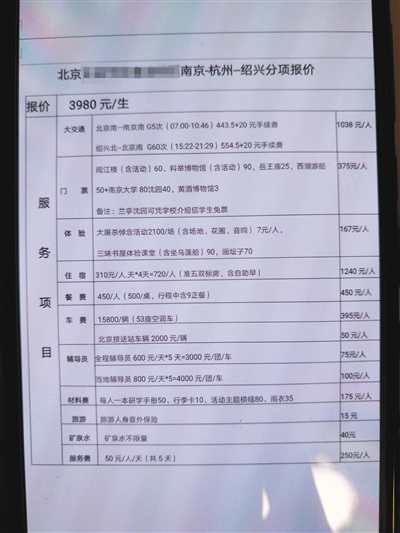 海淀區(qū)某中學(xué)則向家長(zhǎng)公開了收費(fèi)明細(xì)。在家長(zhǎng)王先生提供的游學(xué)清單上,記者看到5天的研學(xué)旅行費(fèi)用為3980元,游覽地點(diǎn)包括南京大屠殺遇難同胞紀(jì)念館、西湖和魯迅紀(jì)念館等。行程中還設(shè)置了眾多教育內(nèi)容,比如參加南京大學(xué)講座、著漢服行謝師禮、探究杭州西湖的光學(xué)現(xiàn)象等。