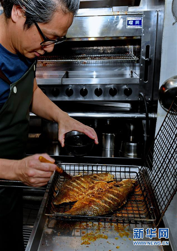 臺(tái)北市“一品言”餐館老板兼大廚劉添吉在加工烤魚(4月24日攝)。新華社記者 張國(guó)俊 攝