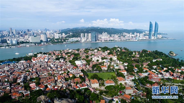 這是鳥(niǎo)瞰廈門(mén)鼓浪嶼和廈門(mén)島(2017年8月24日攝)。新華社記者 王建華 攝