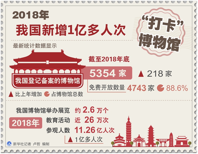 新華社長沙5月18日電(記者施雨岑、柳王敏)最新統(tǒng)計(jì)數(shù)據(jù)顯示,2018年,我國博物館舉辦展覽約2.6萬個(gè),教育活動(dòng)近26萬次,參觀人數(shù)達(dá)11.26億人次,比上年增加1億多人次。