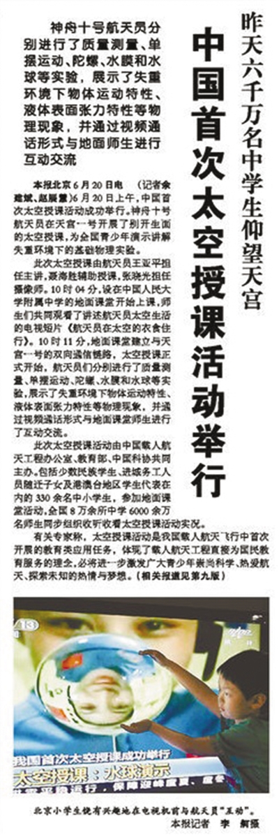 2013年6月21日人民日?qǐng)?bào)頭版報(bào)道太空授課。資料圖片
