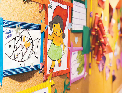 在北京五彩鹿高碑店校區(qū)的走廊墻壁上,張貼著自閉癥譜系障礙兒童的繪畫(huà)作品。畫(huà)筆下藏著孩子心中五彩斑斕的世界。記者 孫亞慧攝