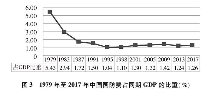 改革開放以來,中國國防開支經(jīng)歷了從維持性投入到適度增長的發(fā)展歷程,總體保持與國家經(jīng)濟(jì)和財(cái)政支出同步適度協(xié)調(diào)增長。國防費(fèi)占國內(nèi)生產(chǎn)總值(GDP)比重從1979年最高的5.43%下降到2017年的1.26%,近30年一直保持在2%以內(nèi)。1979年國防費(fèi)占國家財(cái)政支出比重為17.37%,2017年為5.14%,下降超過12個(gè)百分點(diǎn),總體下降趨勢明顯。