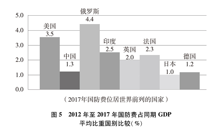 從國防費(fèi)占國內(nèi)生產(chǎn)總值比重看,2012年至2017年,中國國防費(fèi)占國內(nèi)生產(chǎn)總值平均比重約為1.3%,美國約為3.5%、俄羅斯約為4.4%、印度約為2.5%、英國約為2.0%、法國約為2.3%、日本約為1.0%、德國約為1.2%。中國國防費(fèi)占國內(nèi)生產(chǎn)總值的平均比重在國防費(fèi)位居世界前列的國家中排在第六位,是聯(lián)合國安理會常任理事國中最低的。