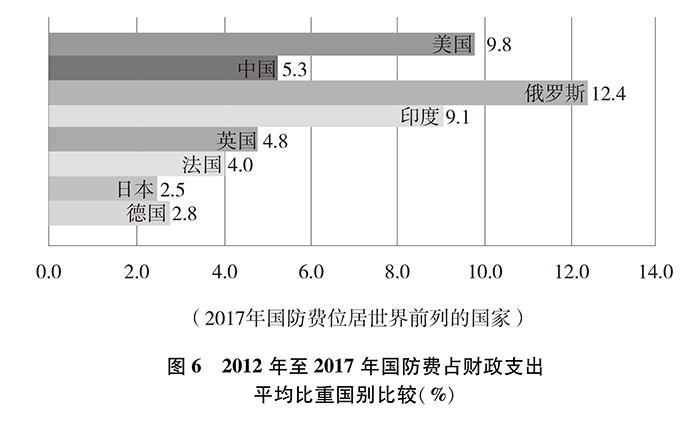 從國防費(fèi)占財(cái)政支出比重看,2012年至2017年,中國國防費(fèi)占財(cái)政支出平均比重約為5.3%,美國約為9.8%、俄羅斯約為12.4%、印度約為9.1%、英國約為4.8%、法國約為4.0%、日本約為2.5%、德國約為2.8%。中國國防費(fèi)占財(cái)政支出的平均比重排在第四位。