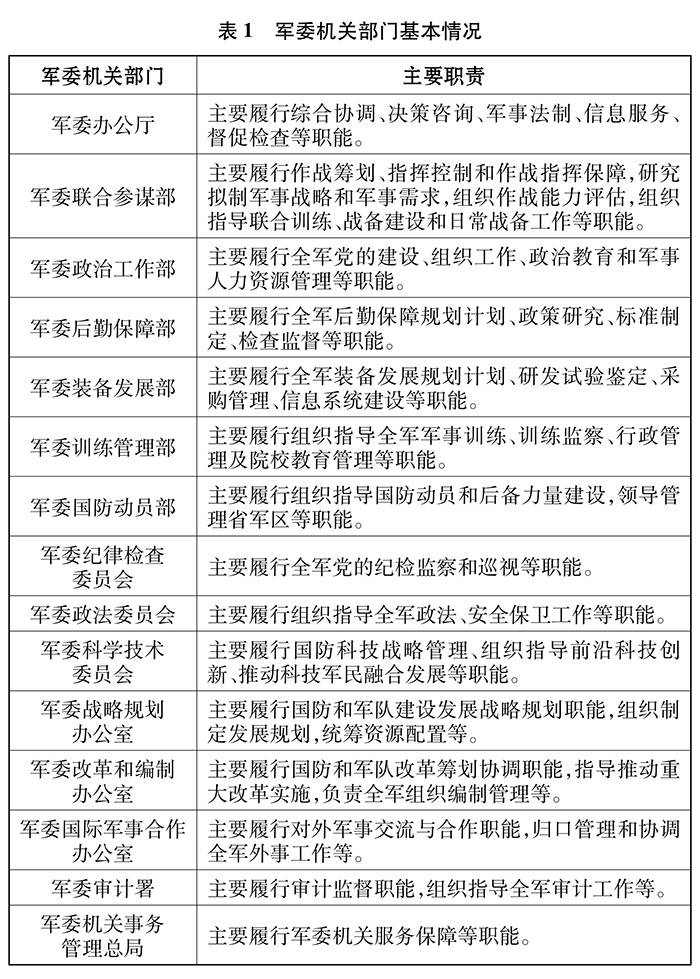 調(diào)整組建新的軍委機(jī)關(guān)部門。優(yōu)化軍委機(jī)關(guān)職能配置和機(jī)構(gòu)設(shè)置,由過去的總參謀部、總政治部、總后勤部、總裝備部四總部調(diào)整為軍委機(jī)關(guān)15個(gè)職能部門,作為軍委集中領(lǐng)導(dǎo)的參謀機(jī)關(guān)、執(zhí)行機(jī)關(guān)、服務(wù)機(jī)關(guān)。指揮、建設(shè)、管理、監(jiān)督等路徑更加清晰,決策、規(guī)劃、執(zhí)行、評估等職能配置更加合理。