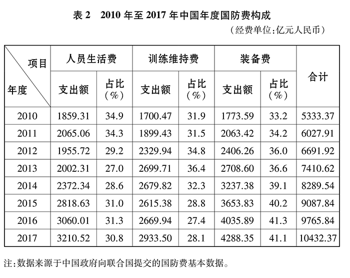 中國國防費(fèi)按用途劃分,主要由人員生活費(fèi)、訓(xùn)練維持費(fèi)和裝備費(fèi)構(gòu)成。人員生活費(fèi)用于軍官、文職干部、士兵和聘用的非現(xiàn)役人員,以及軍隊(duì)供養(yǎng)的離退休干部工資、津貼、伙食、被裝、保險(xiǎn)、福利、撫恤等。訓(xùn)練維持費(fèi)用于部隊(duì)訓(xùn)練、院校教育、工程設(shè)施建設(shè)維護(hù)以及其他日常消耗性支出。裝備費(fèi)用于武器裝備的研究、試驗(yàn)、采購、維修、運(yùn)輸、儲存等。國防費(fèi)的保障范圍包括現(xiàn)役部隊(duì)、預(yù)備役部隊(duì)、民兵等。