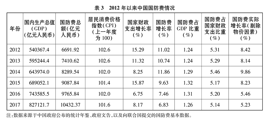 2012年至2017年,中國國防費(fèi)從6691.92億元人民幣增加到10432.37億元人民幣。中國國內(nèi)生產(chǎn)總值(GDP)按當(dāng)年價(jià)格計(jì)算年平均增長9.04%,國家財(cái)政支出年平均增長10.43%,國防費(fèi)年平均增長9.42%,國防費(fèi)占國內(nèi)生產(chǎn)總值平均比重為1.28%,占國家財(cái)政支出平均比重為5.26%。國防費(fèi)占國內(nèi)生產(chǎn)總值的比重穩(wěn)定,與國家財(cái)政支出保持同步協(xié)調(diào)增長。