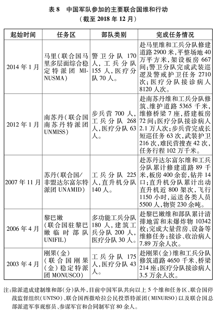 中國積極支持聯(lián)合國維和行動,是聯(lián)合國維和行動的主要出資國之一,是安理會常任理事國中第一大出兵國。截至2018年12月,中國軍隊(duì)已累計(jì)參加24項(xiàng)聯(lián)合國維和行動,派出維和軍事人員3.9萬余人次,13名中國軍人犧牲在維和一線。中國軍隊(duì)在維和任務(wù)區(qū)新建、修復(fù)道路1.3萬余千米,排除地雷及各類未爆物10342枚;運(yùn)送物資135萬余噸,運(yùn)輸總里程1300萬余千米;接診病人17萬余人次;完成武裝護(hù)衛(wèi)、長短途巡邏等任務(wù)300余次。