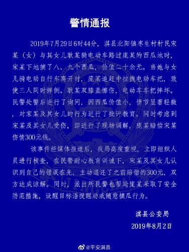 根據(jù)淇縣公安局官方微博發(fā)布的通報(bào),7月29日6時(shí)44分,淇縣北陽鎮(zhèn)棗生村村民宋某(女)與其女兒耿某騎電動車路過龐某的西瓜地時(shí),宋某下地摘了八、九個西瓜,價(jià)值二十余元。當(dāng)她與女兒騎電動自行車離開時(shí),龐某追趕中拉拽電動車把,致使三人同時(shí)摔倒。耿某雙膝蓋擦傷,電動車車把摔壞。民警出警后進(jìn)行了詢問,因西瓜價(jià)值小,情節(jié)顯著輕微,對宋某及其女兒的行為進(jìn)行了批評教育。同時(shí)考慮到宋某及其女兒受傷,即進(jìn)行了現(xiàn)場調(diào)解,龐某賠償宋某傷情300元。