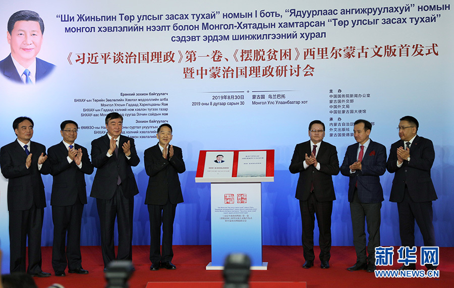 新華社烏蘭巴托8月30日電? 為慶祝中蒙建交70周年,由中國(guó)國(guó)務(wù)院新聞辦公室、蒙古國(guó)外交部、中國(guó)外文局、中國(guó)駐蒙古國(guó)大使館主辦的《習(xí)近平談治國(guó)理政》第一卷、《擺脫貧困》西里爾蒙古文版首發(fā)式暨中蒙治國(guó)理政研討會(huì)在蒙古國(guó)首都烏蘭巴托舉行。蒙古國(guó)總統(tǒng)巴特圖勒嘎發(fā)來(lái)賀信。中宣部副部長(zhǎng)蔣建國(guó)、中國(guó)駐蒙古國(guó)大使邢海明,蒙古國(guó)副總理恩赫?qǐng)D布辛、外交部長(zhǎng)朝格特巴特爾、總統(tǒng)外事顧問(wèn)特格希扎爾格勒、蒙古人民黨書記巴特恩赫等260多名代表參會(huì)。