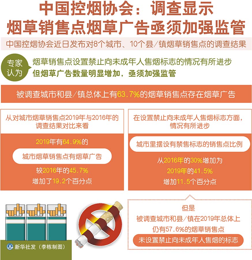 新華社北京9月5日電(記者林苗苗)中國控?zé)焻f(xié)會近日發(fā)布對8個城市、10個縣/鎮(zhèn)煙草銷售點的調(diào)查結(jié)果。專家認(rèn)為,煙草銷售點設(shè)置禁止向未成年人售煙標(biāo)志的情況有所進(jìn)步,但煙草廣告數(shù)量明顯增加,亟須加強監(jiān)管。