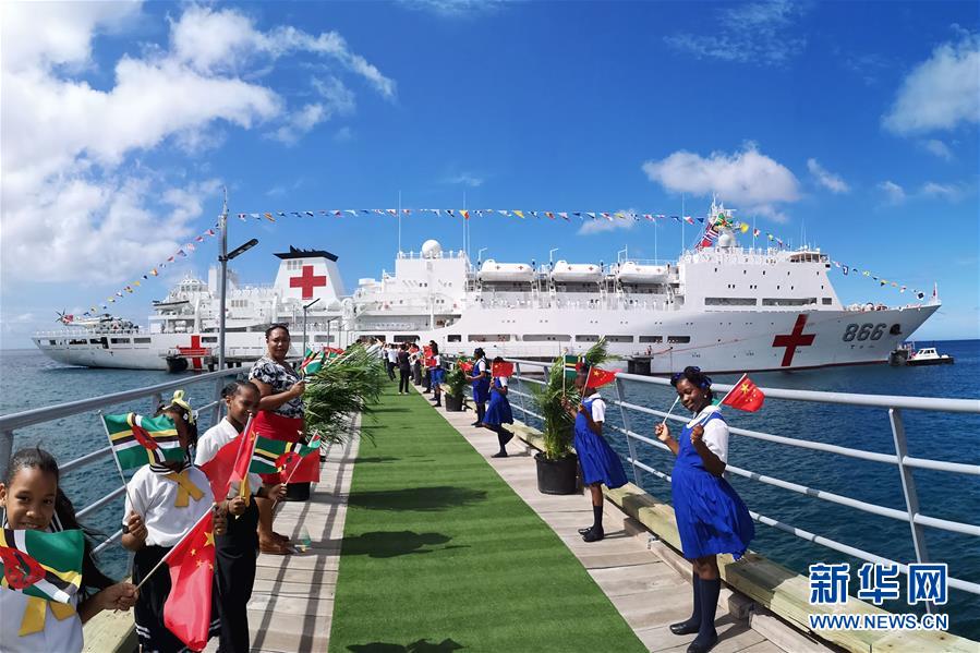 在多米尼克首都羅索,當(dāng)?shù)貙W(xué)生揮動多中兩國國旗歡迎中國海軍和平方舟醫(yī)院船首次到訪(2018年10月12日攝)。 新華社發(fā)(江山 攝)