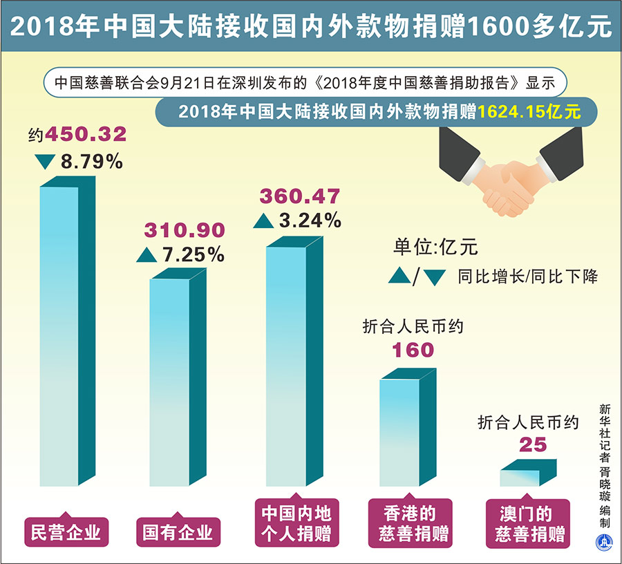 新華社深圳9月21日電(記者王豐、李曉玲)中國(guó)慈善聯(lián)合會(huì)21日在深圳發(fā)布的《2018年度中國(guó)慈善捐助報(bào)告》顯示,2018年中國(guó)大陸接收國(guó)內(nèi)外款物捐贈(zèng)1624.15億元。