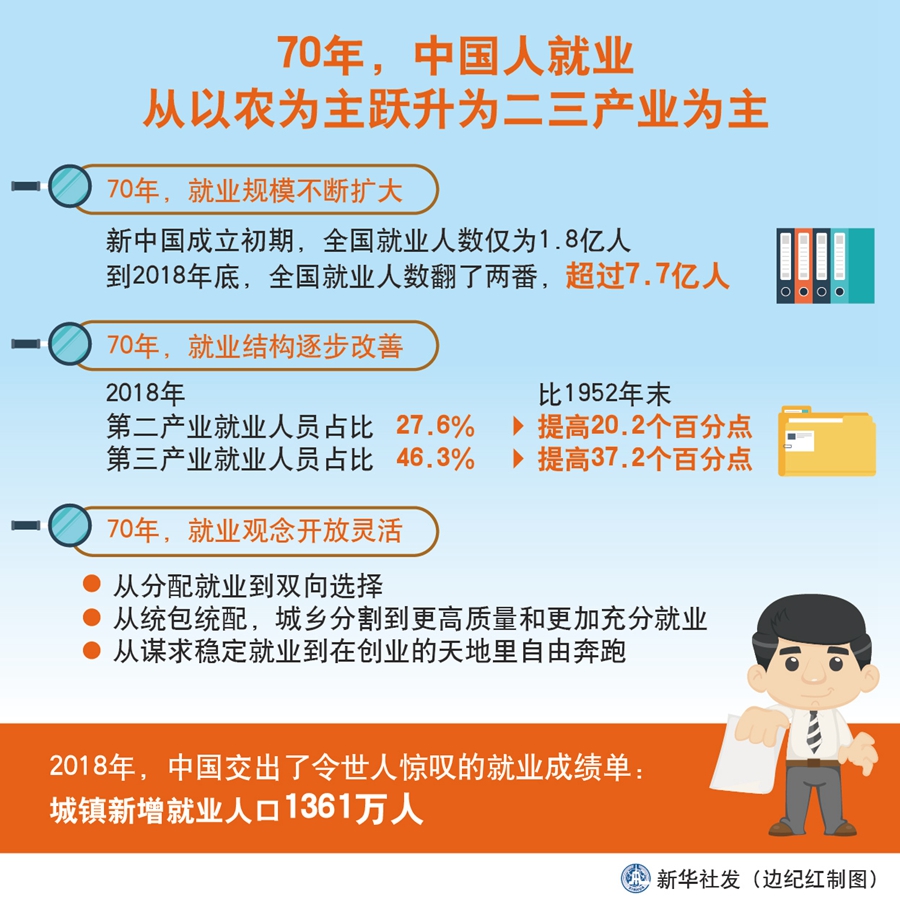 新華社北京9月24日電(記者葉昊鳴)從新中國(guó)成立之初大多數(shù)勞動(dòng)者以農(nóng)為主,到2018年第二、三產(chǎn)業(yè)就業(yè)人員占比超七成,服務(wù)業(yè)占主導(dǎo)的現(xiàn)代就業(yè)模式逐步形成,并日漸成為推動(dòng)我國(guó)經(jīng)濟(jì)社會(huì)發(fā)展的重要力量。