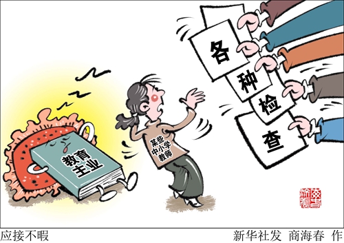 事實上,早在今年3月中辦就發(fā)布《關(guān)于解決形式主義突出問題為基層減負的通知》,強調(diào)今年要解決一些困擾基層的形式主義問題,切實為基層減負?!靶氯A視點”記者近日調(diào)查發(fā)現(xiàn),在一些地方的中小學,各種檢查以及與教學無關(guān)的活動紛紛進校園,令教師們不堪重負甚至影響了教學工作。