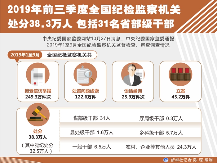 新華社北京10月27日電(記者朱基釵)中央紀委國家監(jiān)委網站27日消息,中央紀委國家監(jiān)委通報2019年1至9月全國紀檢監(jiān)察機關監(jiān)督檢查、審查調查情況。2019年1至9月,全國紀檢監(jiān)察機關共接受信訪舉報249.3萬件次,立案45.2萬件,處分38.3萬人,包括省部級干部31人,廳局級干部0.3萬人。