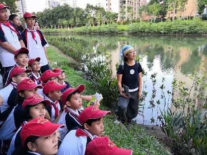海南松鼠學堂創(chuàng)始人高高老師帶領(lǐng)??谄咧械膶W生觀察濕地的生態(tài)環(huán)境