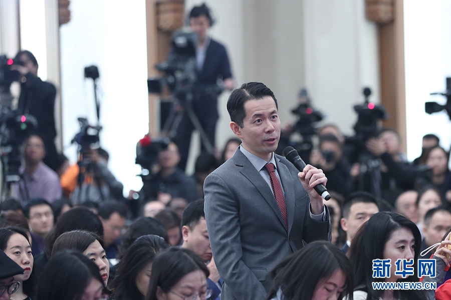 十三屆全國(guó)人大二次會(huì)議3月4日上午11時(shí)15分在人民大會(huì)堂新聞發(fā)布廳舉行新聞發(fā)布會(huì),由大會(huì)發(fā)言人張業(yè)遂就大會(huì)議程和人大工作相關(guān)的問題回答中外記者提問。圖為美國(guó)有線電視新聞?dòng)浾咛釂?。新華網(wǎng)/中國(guó)政府網(wǎng) 陳杰 攝